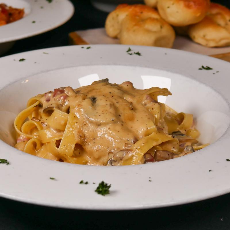 Pancetta, mushrooms, garlic over creamy alfredo sauce