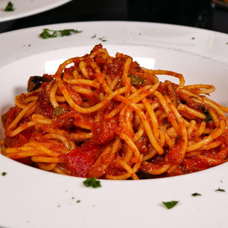 Sautéed anchovies, fresh basil, garlic, capers, kalamata olives, and red chilli peppers over Sherry wine pomodoro sauce