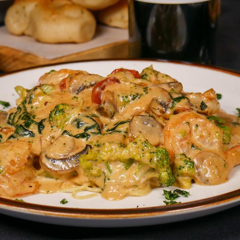 Sautéed mushrooms, spinach, broccoli, and cherry tomatoes in creamy alfredo sauce over spaghetti